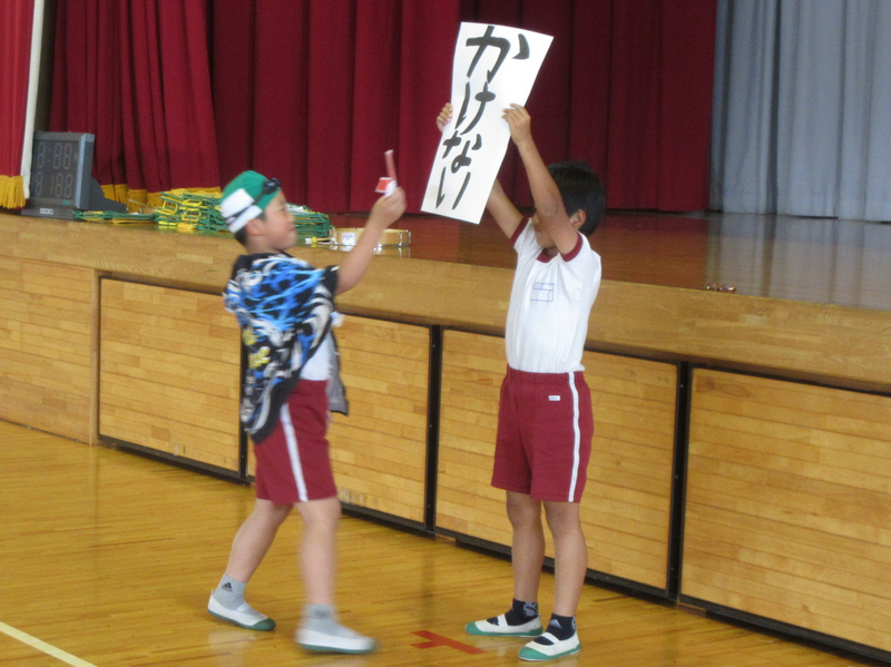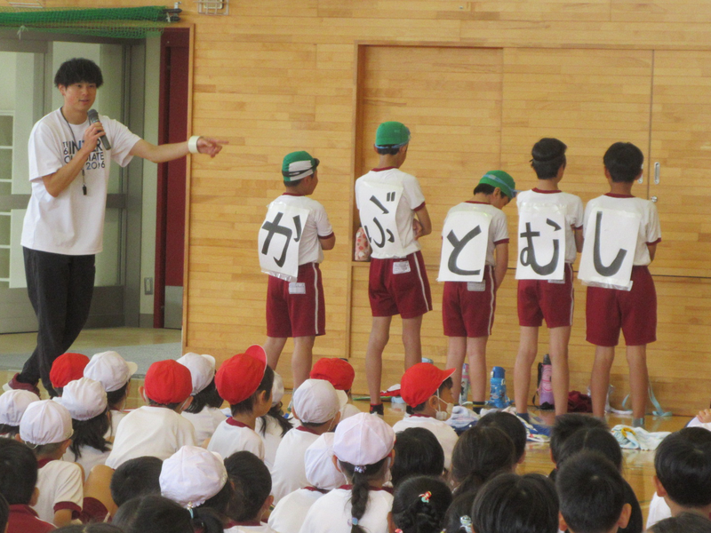 2024年6月3日 13時23分 体育館で「プール開きの会」が行われ、体育委員の児童が「マモルンジャー」に扮してプール学習のきまりをわかりやすく説明しました。