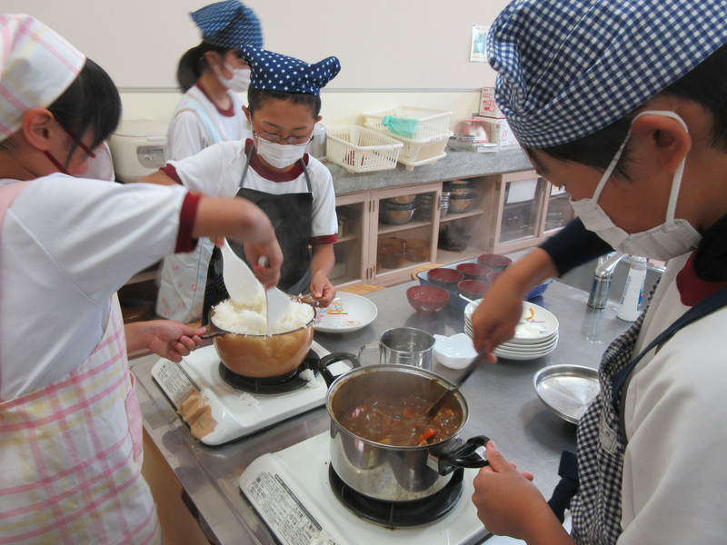 家庭科で5年生がご飯とカレー作りに挑戦しました。鍋でご飯を炊き、包丁の扱いに気をつけながら野菜を切ってカレーを作りました。