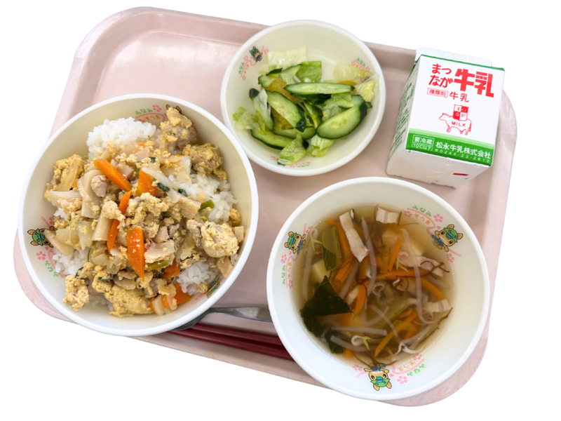 本日の献立:親子丼 もずくスープ みかんサラダ 牛乳