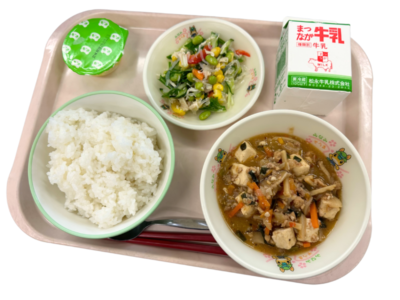 本日の献立:ご飯 麻婆豆腐 水菜とコーンの和え物 県産一口りんごコンポート 牛乳