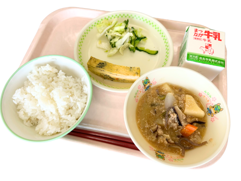 本日の献立:ご飯 じゃがいものそぼろ煮 県産五目厚焼き玉子 キャベツの浅漬 牛乳