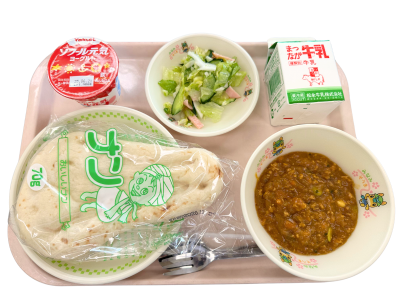 本日の献立:ナン キーマカレー フレンチサラダ ヨーグルト 牛乳
