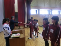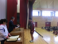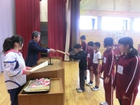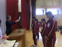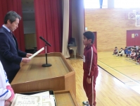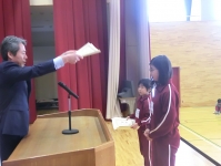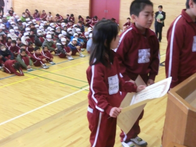 避難訓練の後、全校集会を開き、賞状の伝達をしました。
