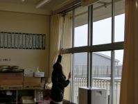 教室の床をきれいに磨きます。 出入り口の窓も拭いてもらいました。