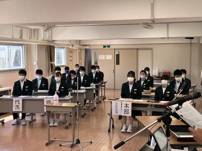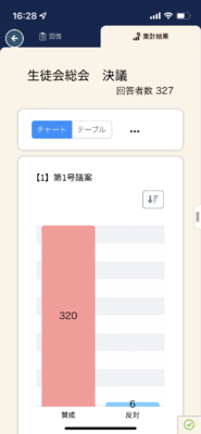議事の採決は、「ロイロノート」のアンケート機能を使い、オンラインで各教室から「賛成・反対」の意思表示をしました。 → |