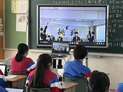 「 『google meet』を使って各教室に中継 」は、もうすっかりおなじみになって、いつもの学校のワンシーンとなっています。 今回は、中継元を体育館から多目的ルームに変更しました。教室からの距離が近いので質問者が行き来しやすくなる、教室の雰囲気が伝わりやすいというメリットがあるからです。 | ||