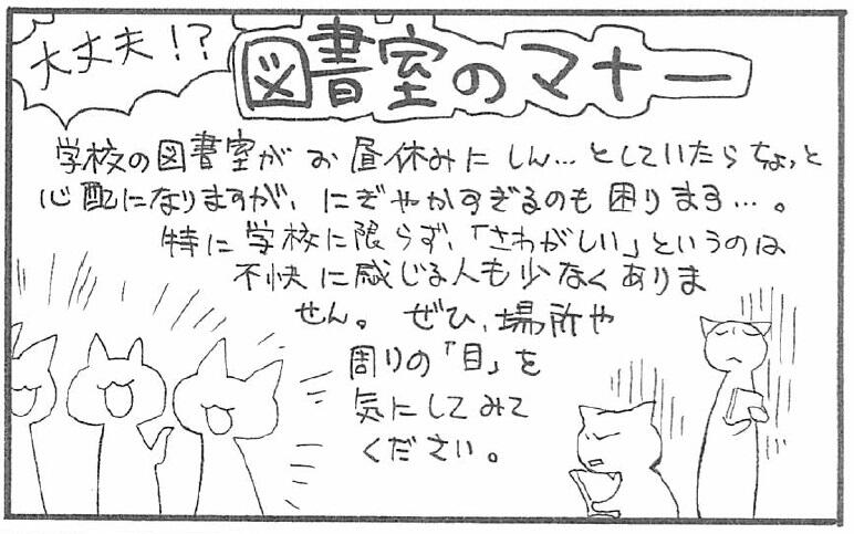 図書室・図書館に限らず「公共の場所」では、「周りの目」に気を配ることが大切ですね。
