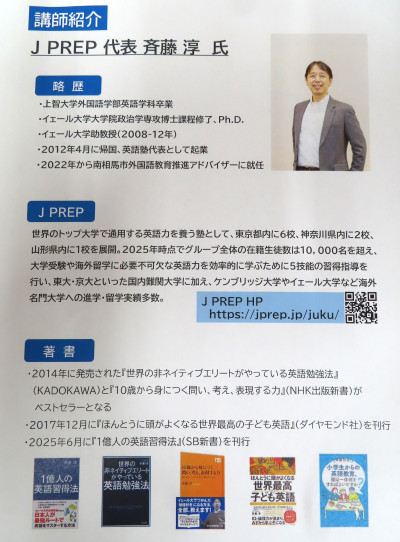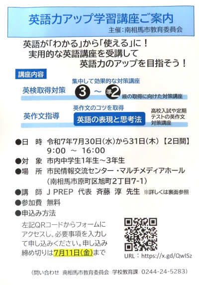 2025年7月1日 17時13分市教委で行っている英語力アップ学習講座ですが、まだまだ定員に余裕があるらしく再度の募集がありました。(注意:実施日と場所、対象学年に変更がありました。7月30日と31日、場所は市立図書館横の情報交流センター、1年生から応募できることになりました)講師の斉藤先生は首都圏や山形県酒田市で人気の英語塾を経営されているすごい方です。直接斉藤先生から学べるなんて、私はうらやましい。英語が苦手な人も先生のお話を聞くだけで、英語に興味が出ると思います。人との出会いで人生が決まることがありますよ。たった2日間です。前向きに一歩踏み出してみませんか?