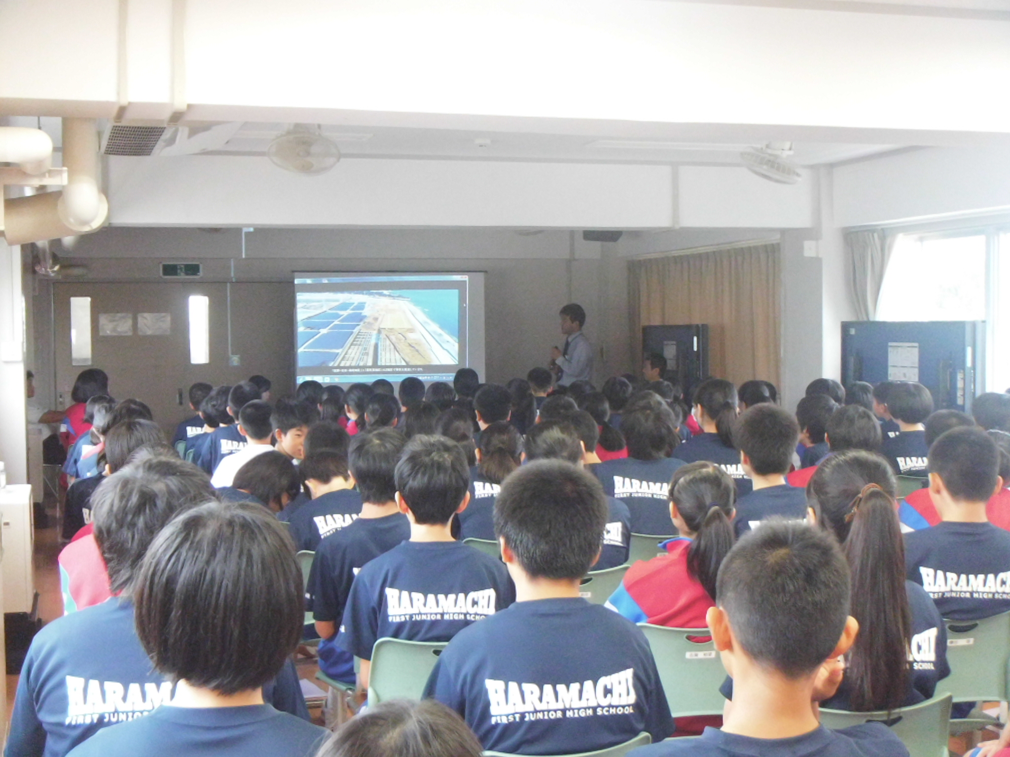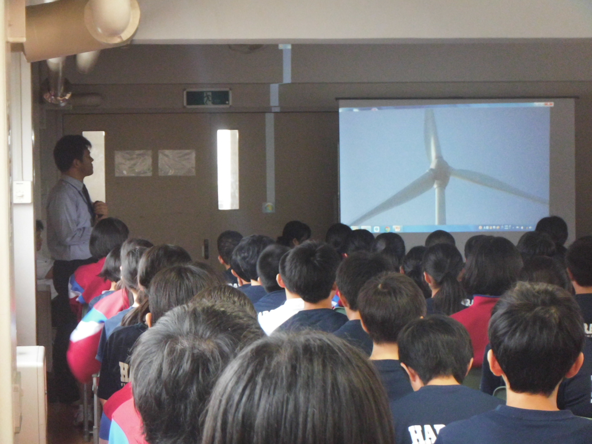 前日の今日は、新エネルギー推進課の方々が来校し、鹿島区沿岸に建設された太陽光発電所と風力発電所についての事前学習をしました。