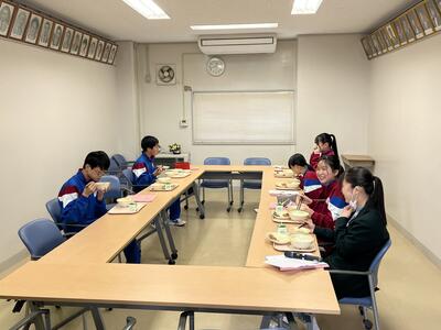 楽しい給食の時間を、より楽しく過ごしてもらおうと、生徒会役員が明るい雰囲気作りに奮闘してくれました。