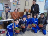 6年総合の学習でお世話になった老人介護施設と保育園へパンジーの鉢植えをプレゼントしてきました。11月に全校生で苗植えをしたときに、鉢に植え育ててきたものです。総合では、「人にやさしいまちづくり」ということで学習してきました。国語の学習とも関連させ、南相馬市を住みやすくするための提言なども考えました。