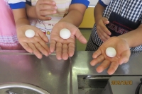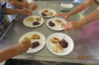 1日(木)野菜の苗植えでもお世話になった  JAの佐藤さん(本校OBでもある)の指導による米粉の団子づくりをしました。オリーブオイルを手に少しつけて米粉を丸めたり、加熱したりしました。「後片付けも調理のひとつだよ。」と声かけられました。きな粉、あんこ、しょうゆで一人6粒ごちそうになりました。とてもおいしくできました。まいう~!