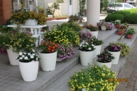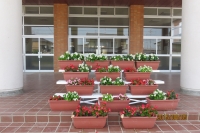 学校玄関前のプランターの花も暑さに負けず、きれいに咲いています。