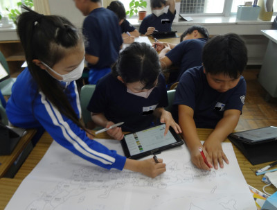 今日は、給食の食材がどこで生産されているのかを調べて、日本地図に書き込む活動を行っていました。