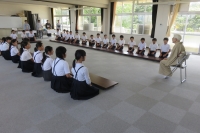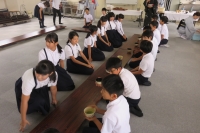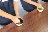 講師は、本校PTA13代会長であった蓼沼光子先生と4人のお弟子さんたちです。鮎の印入りのお饅頭を味わい、いざ抹茶。みんないい笑顔で茶の世界を体験していました。