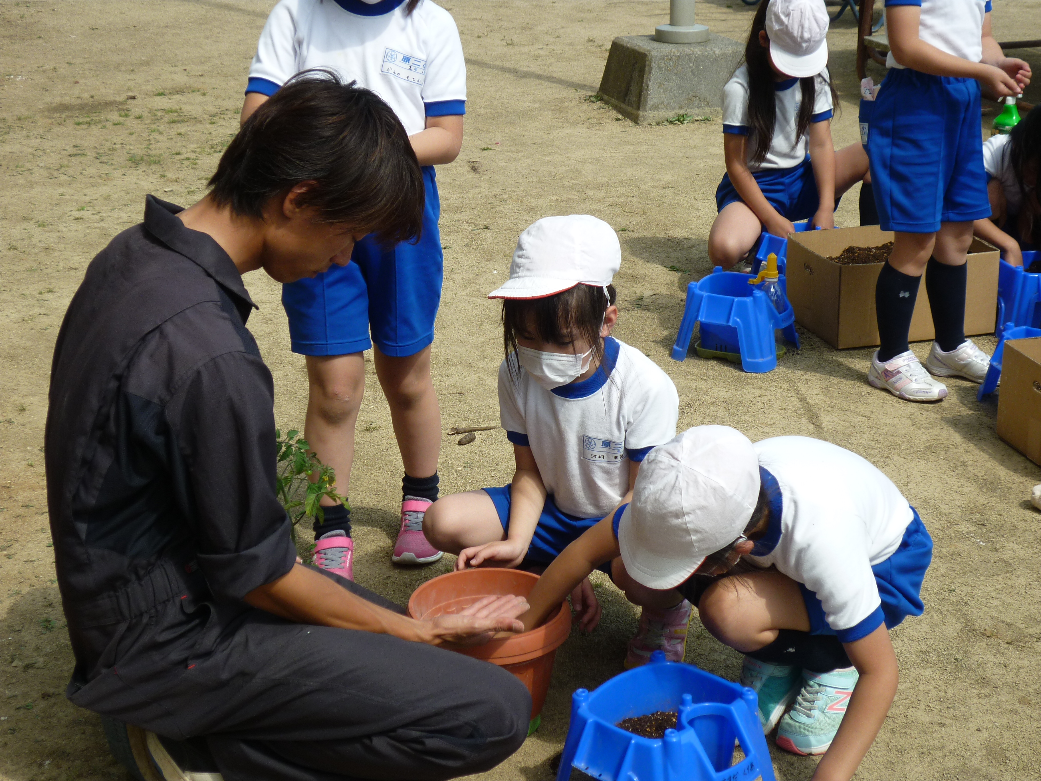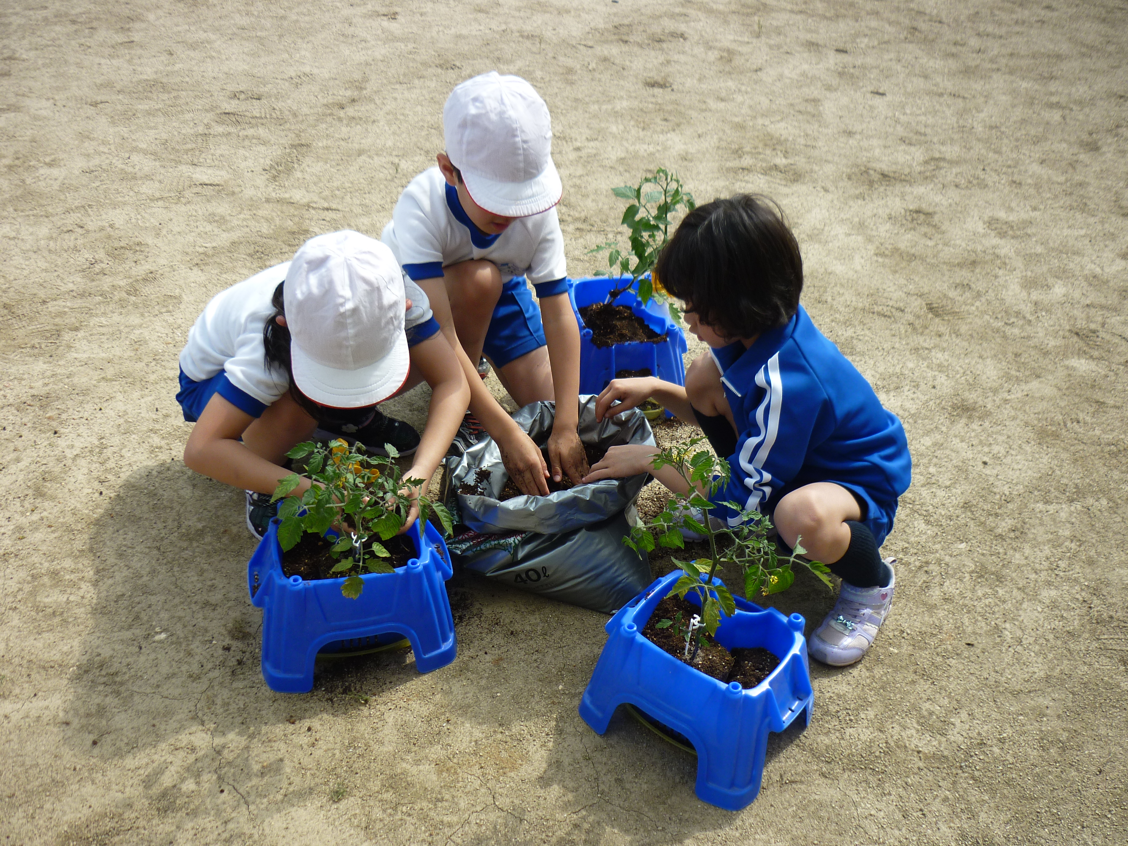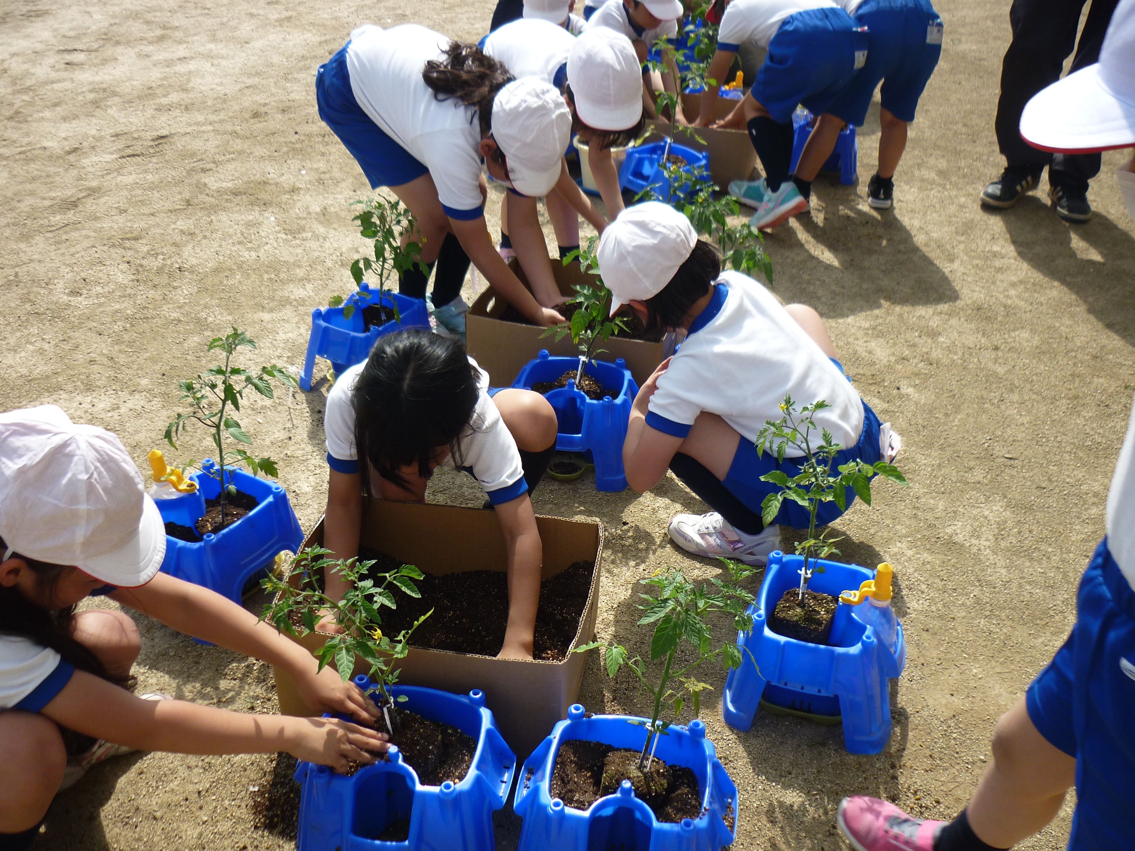 2年生が5校時目にミニトマトの苗を植える授業を行いました。JAふくしま未来の佐藤文宏さんと田部知洋さんからていねいに教えていただきながら、自分の植木鉢に土や肥料を入れて、苗を植えました。食べるのも楽しみですが、しっかりと世話をして、育っていく様子をよく観察してくださいね。