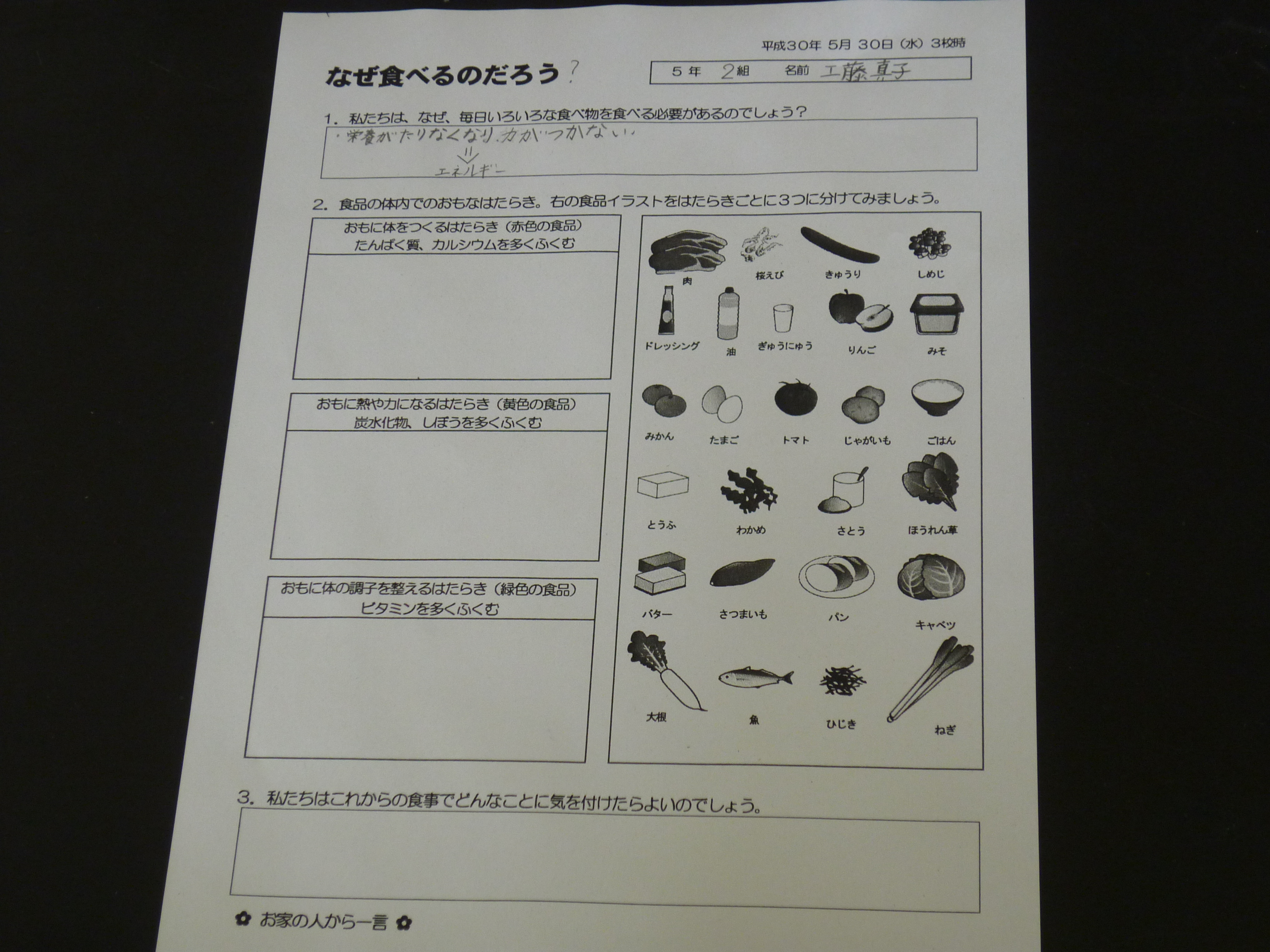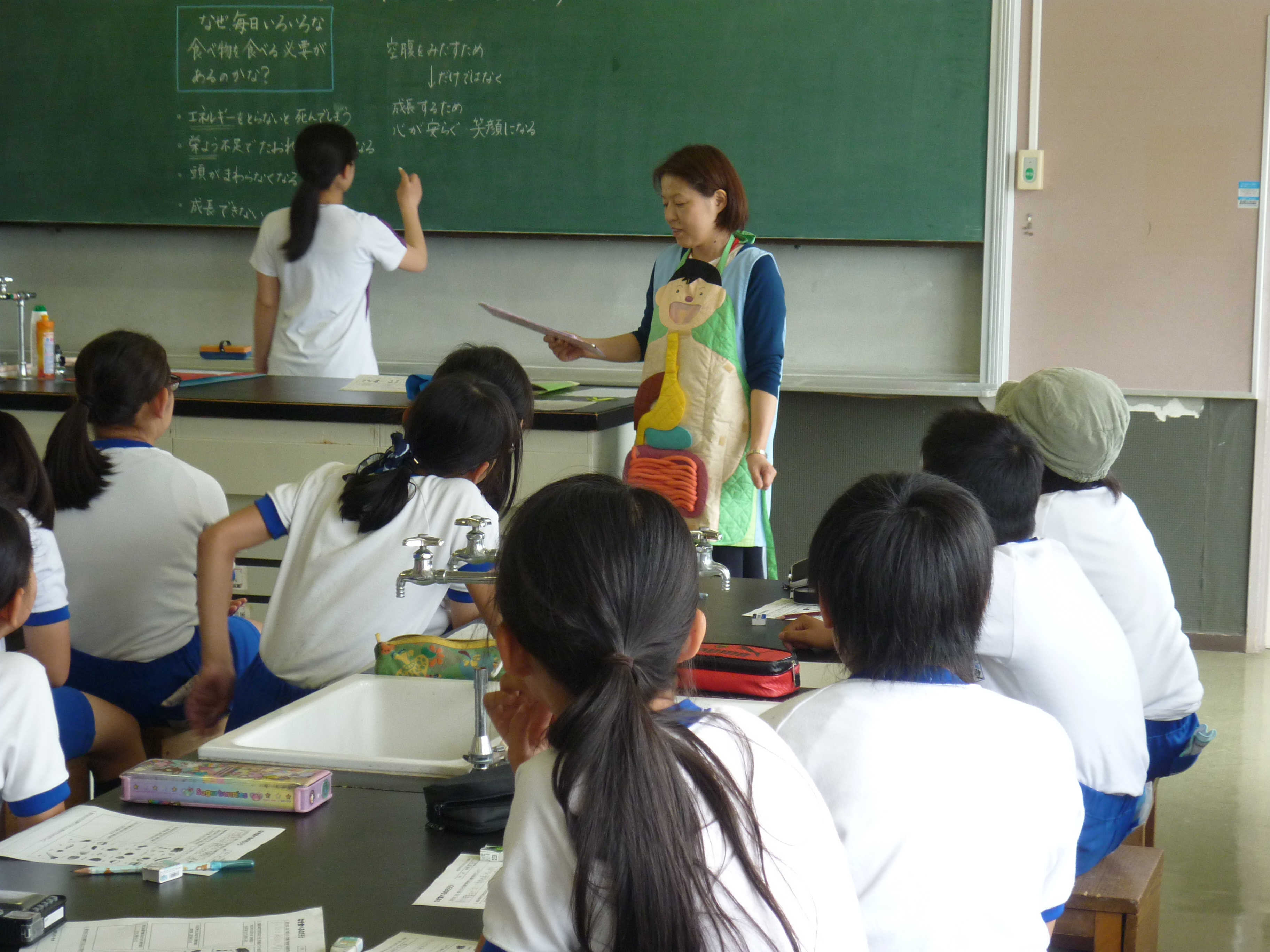 5年生が、3校時目に「食育」についての授業をしました。主任栄養技師の畠山真由美先生を講師に迎え、食べ物がどのように身体に入っていくのかや、私たちの成長に大切な3つの栄養素の働きについて学びました。毎日、口にしている食べ物について興味深く聞いていました。正しい知識を知り、健康な身体をつくっていきたいですね。