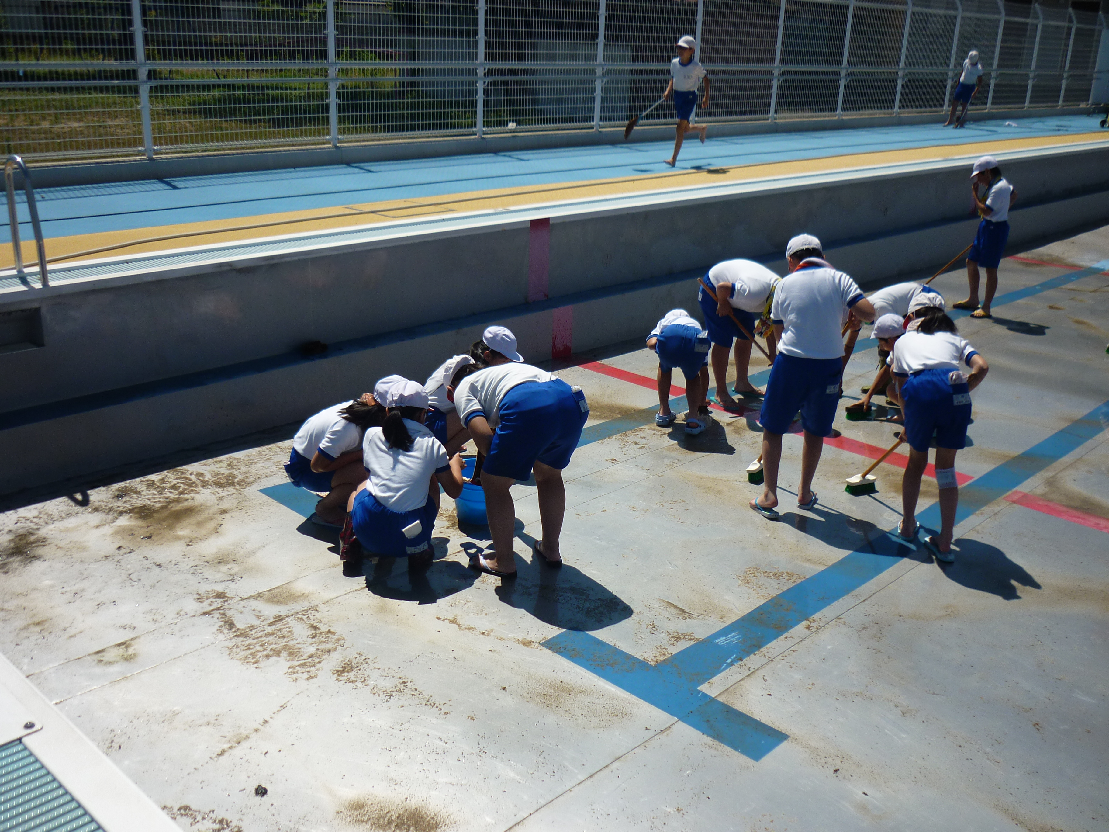 6月19日(火)のプール開きに向けて、3年生から6年生までに児童と先生方でプール清掃を行いました。はじめは汚れていたプールも、全員に力を合わせて磨き始めると、きれいな底が見えてきて、児童は喜びながら清掃していました。今後のプール学習が楽しみですね。