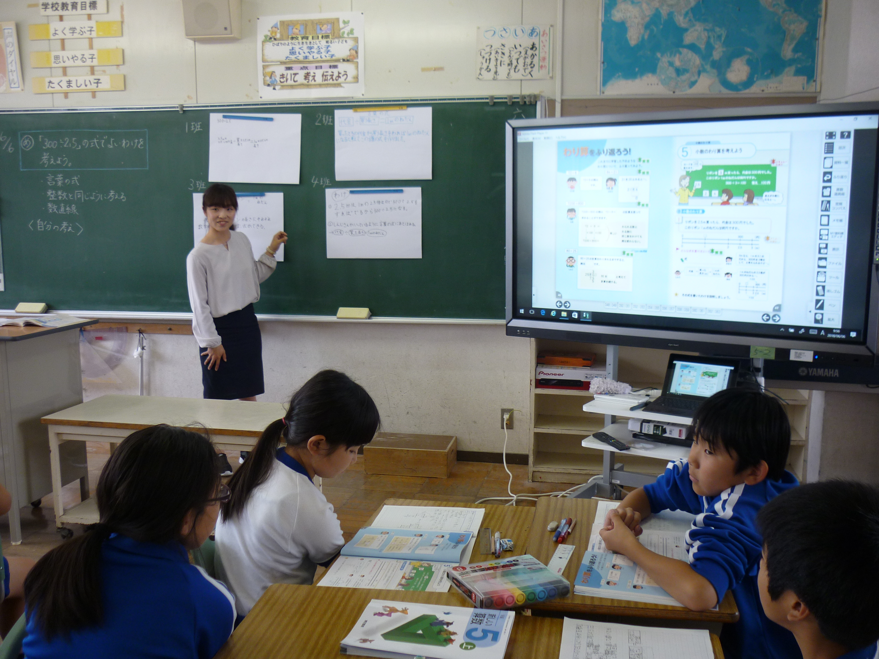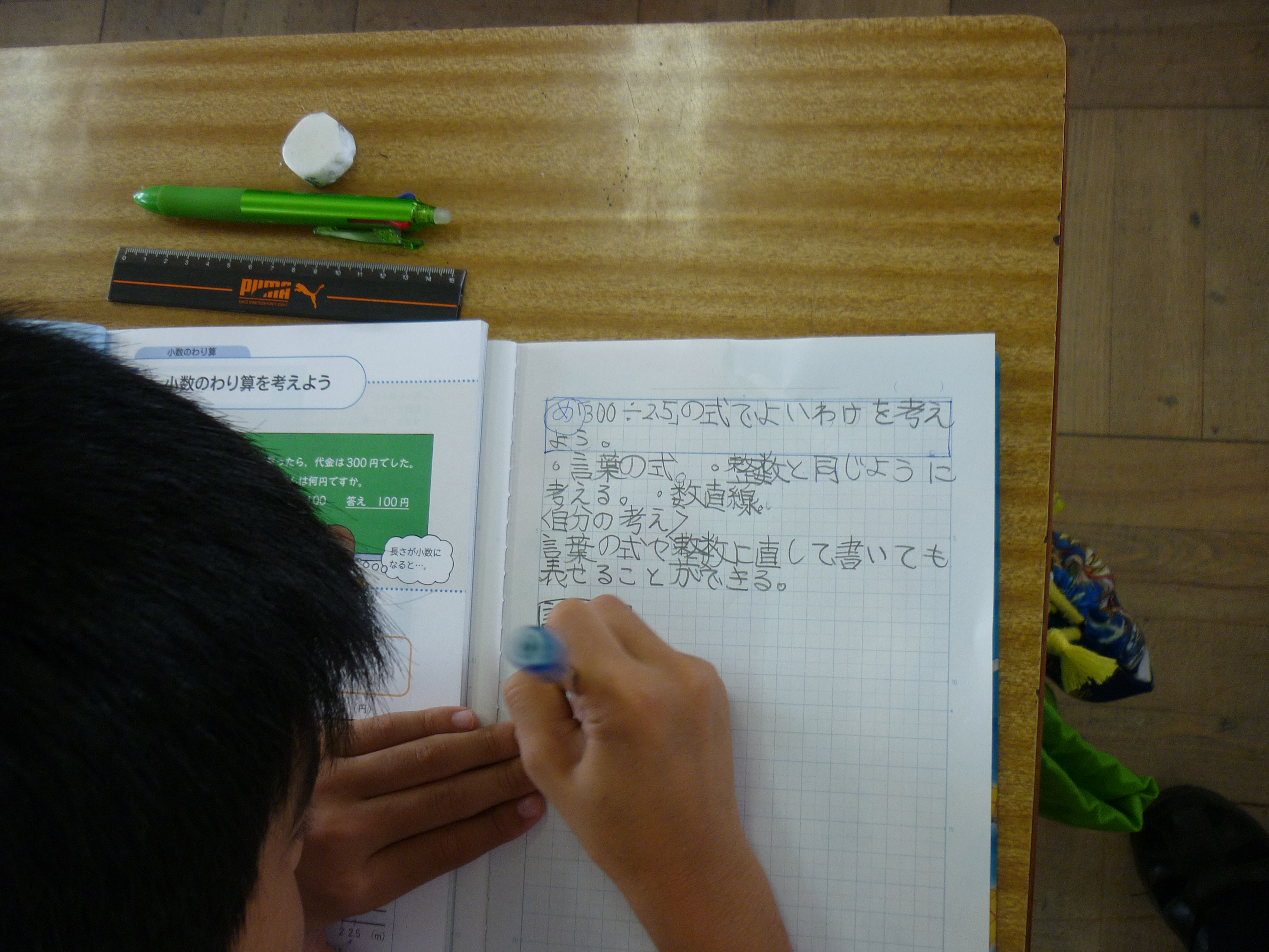 5年2組で、算数の研究授業を行いました。単元は、小数のわり算「小数のわり算を考えよう」です。これまでの授業では、300÷3などわられる数とわる数、どちらも整数でしたが、本時では、300÷2.5とわる数が小数になっている式を立てることができるかどうかを考える授業でした。子ども達は、言葉の式や数直線を使って解いていました。