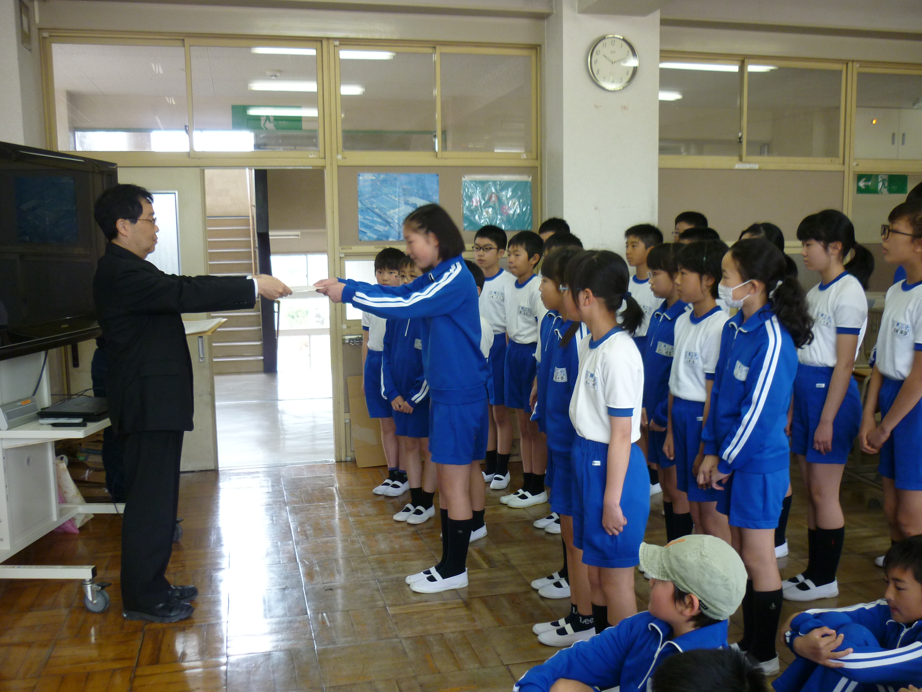 本日の2校時目の休み時間に、6年生に「家庭の交通安全推進員」の委嘱をしました。6年生代表の木幡美紅さんに委嘱状を交付し、4つのことを実行し、交通安全に更に努めるよう約束をしました。6年生が最上級生として率先垂範してくれることを望みます。頑張ってください。