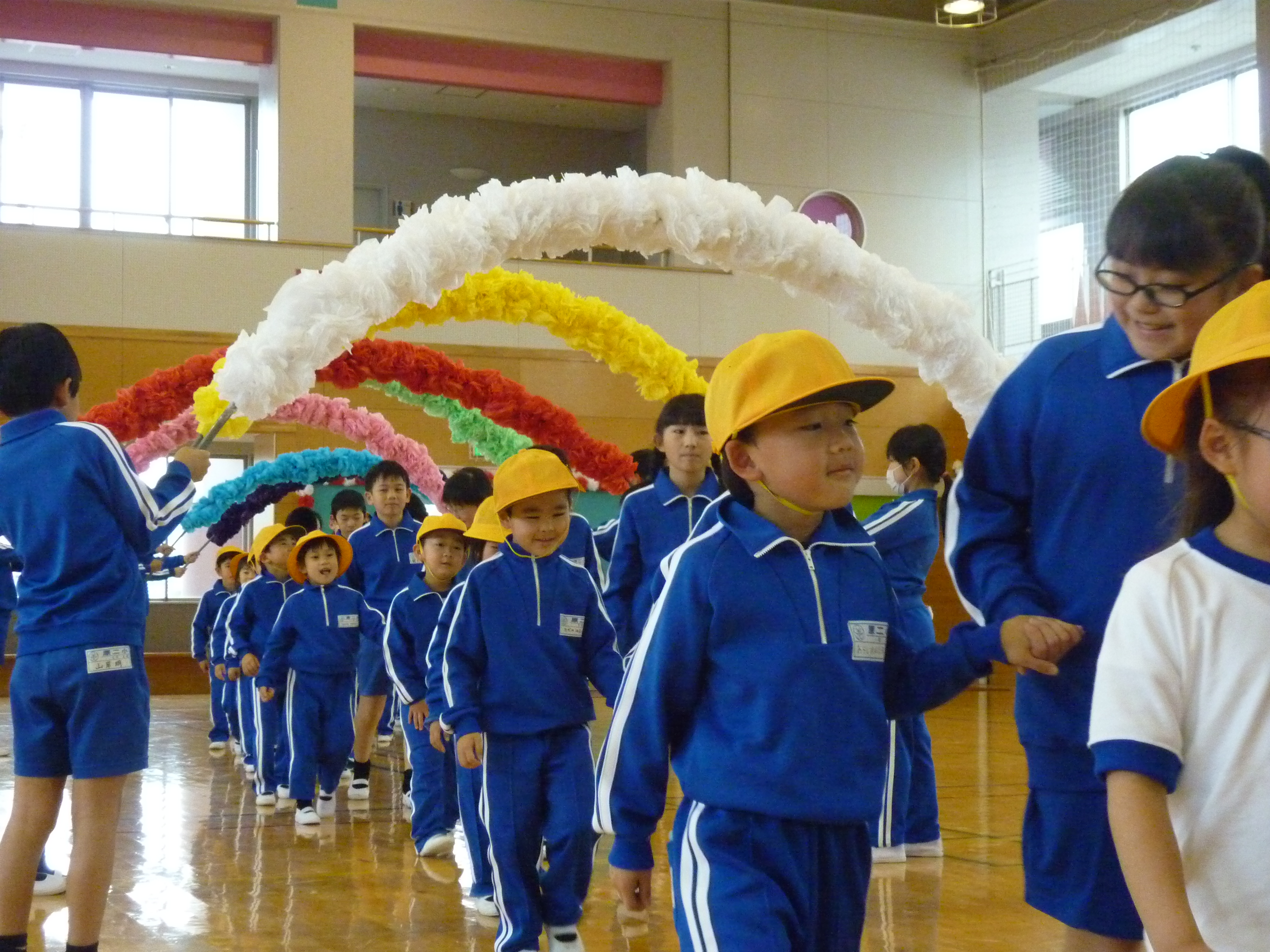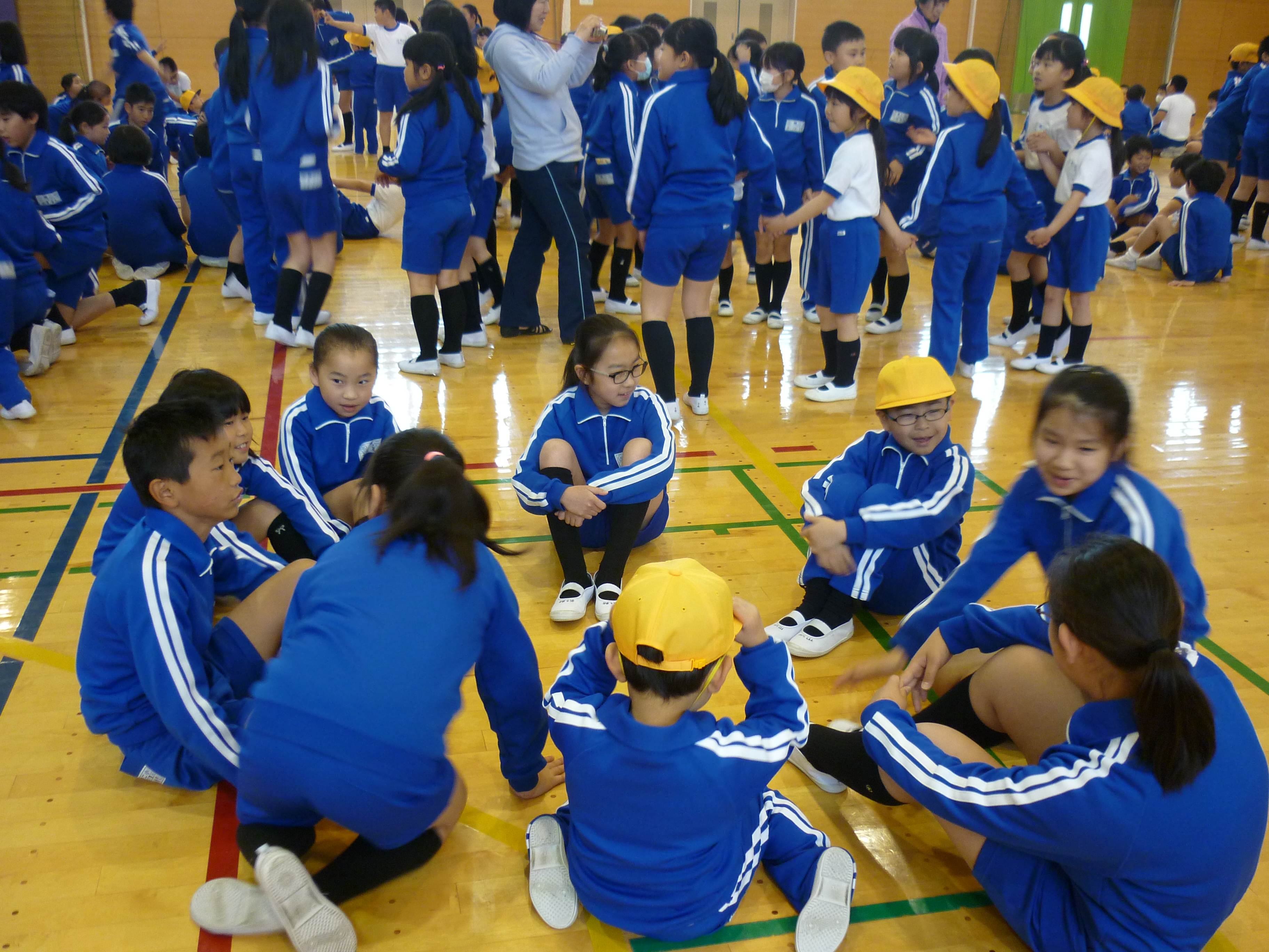 4月24日(火)2校時目に、児童会の集会活動「1年生を迎える会」が開かれました。6年生に手を引かれて入場してきた1年生30名。ちょっと照れながらも盛大な拍手に笑みがこぼれていました。最初に、6年の児童代表からの「歓迎のことば」があり、続いてお待ちかねの全児童でのゲームがありました。「タコの足は、何本ですか?」といった数に関する問題が出され、その数の人数でグループを作るゲームです。そのグループには必ず1年生が入らないといけないため、早く1年生を自分のグループに入ってもらおうと必死に追いかけていました。最後に、2年生からの「ひまわりのたね」のプレゼントがあり、早速中を見て喜んでいました。短い時間でしたが、とっても楽しい時間を過ごすことができました。