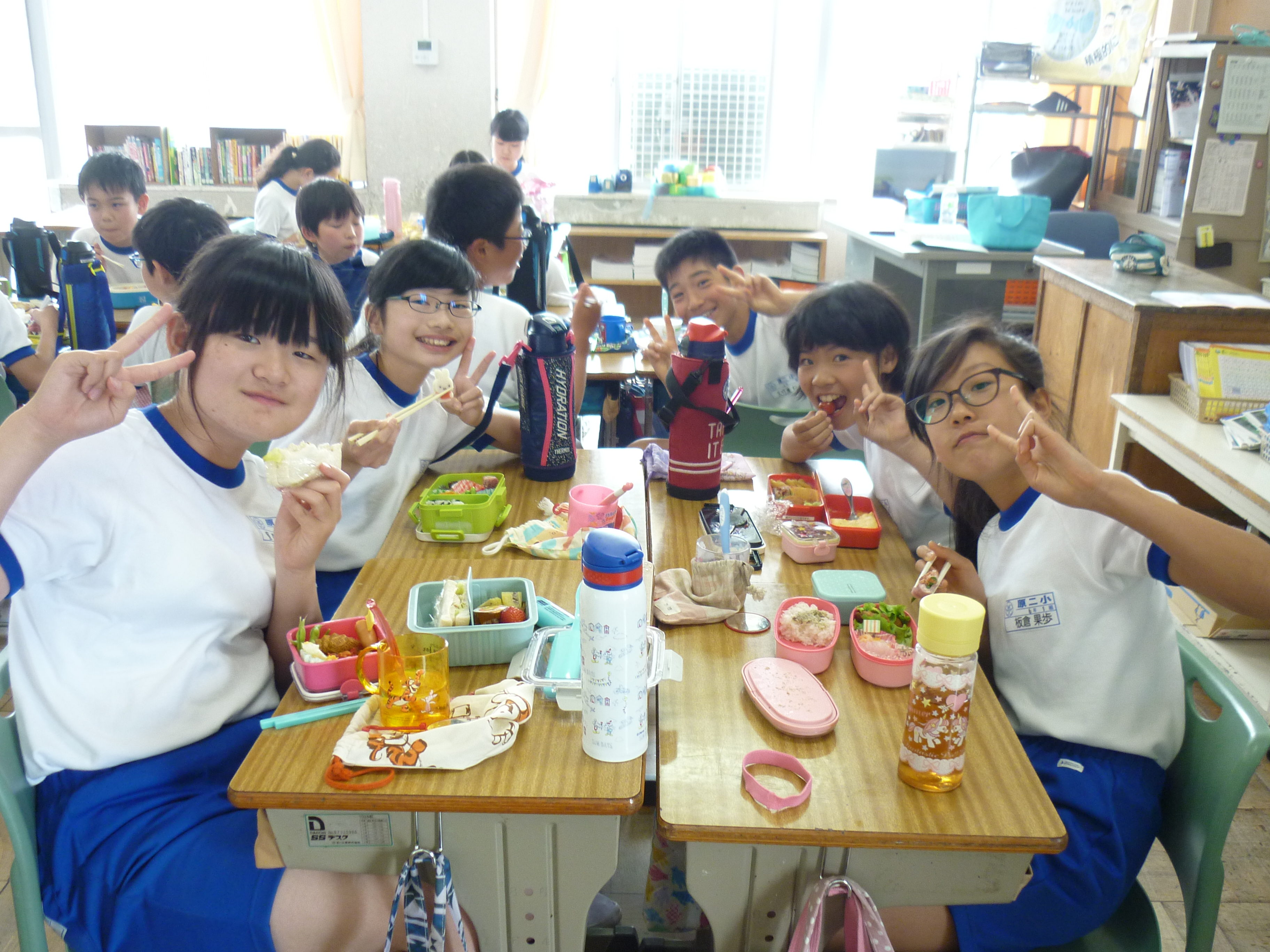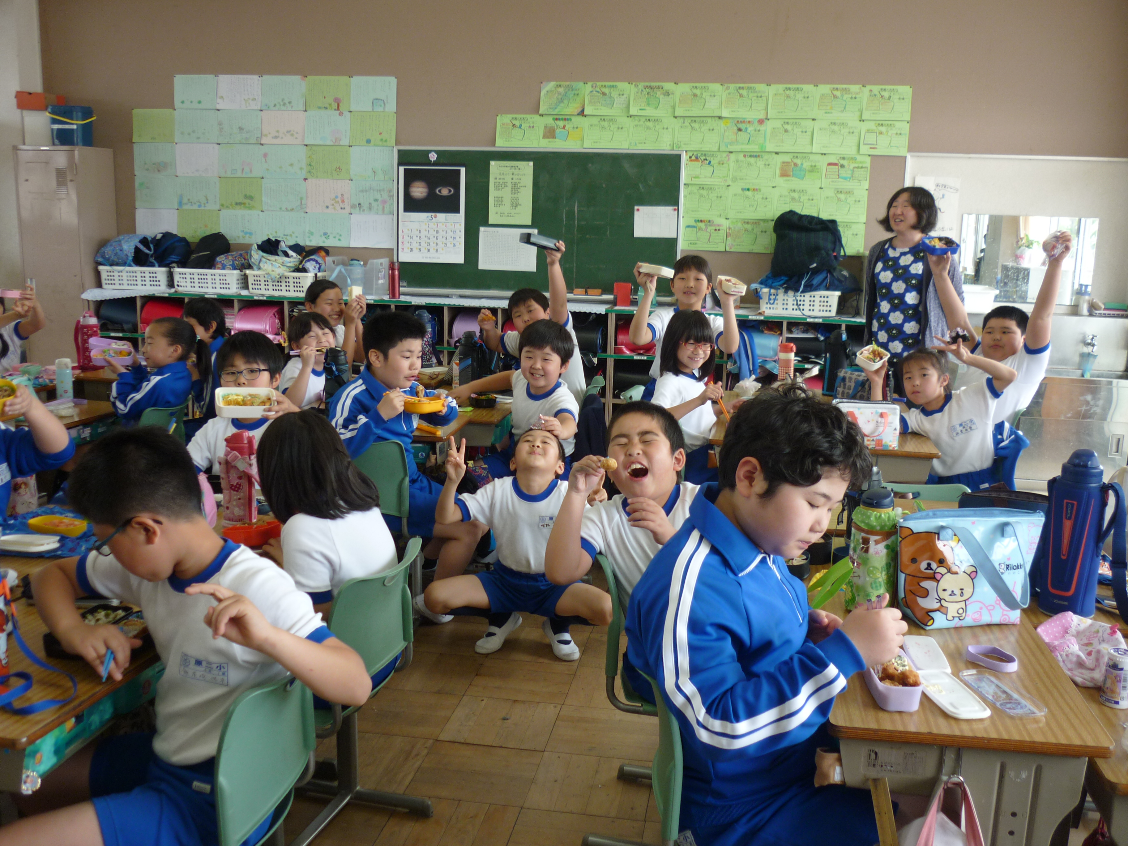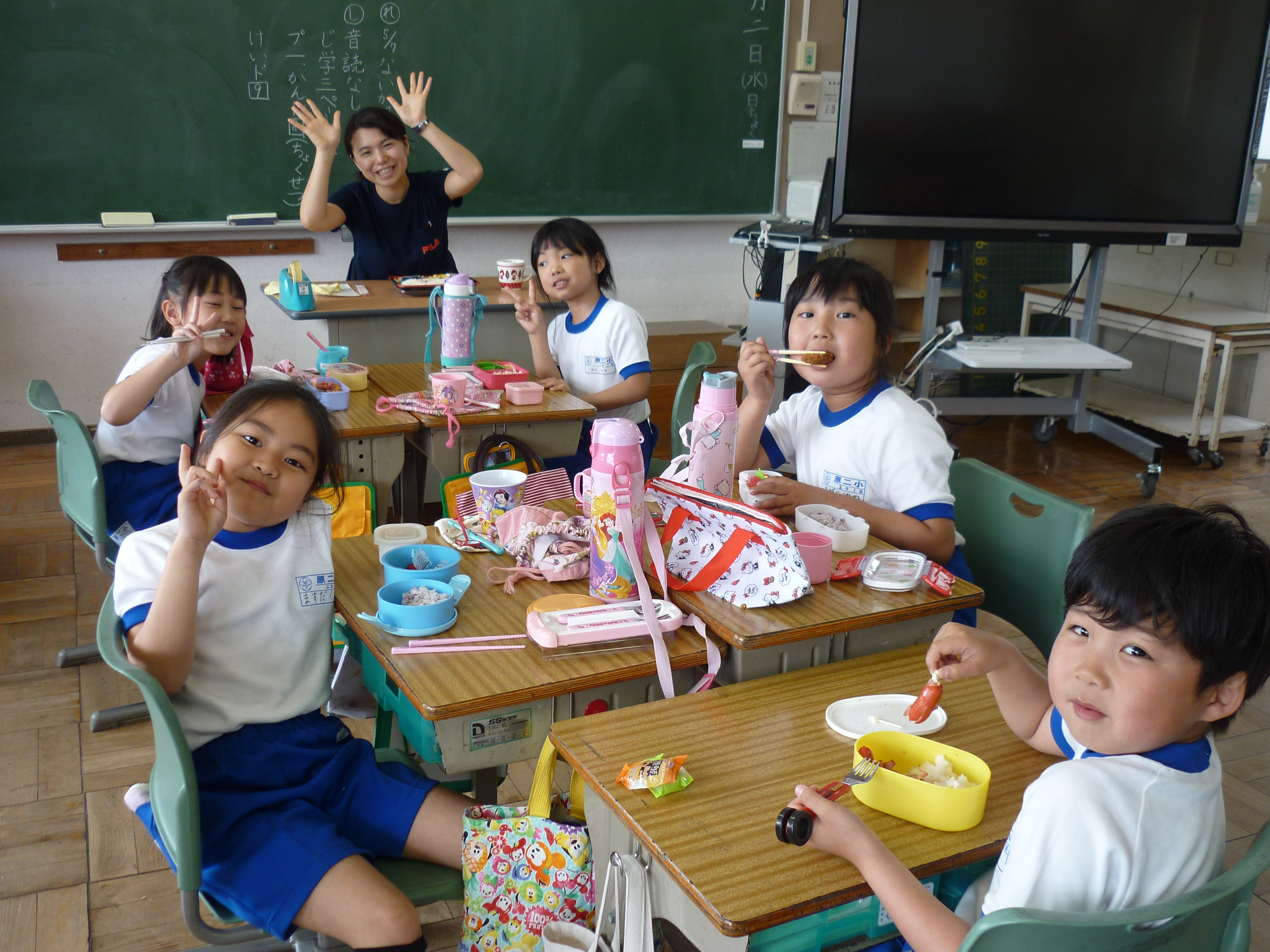 2018年5月2日 12時54分今日は、遠足予備日のため、お弁当の日でした。12時のチャイムを聞くと一斉にお家から持ってきたお弁当をひろげ、美味しそうに食べ始めました。1年生に「お弁当も好きな人は?」と尋ねると、ほとんどの児童が「はい」「大好き」と手を挙げて返事をしていました。お家の方の愛情たっぷりなお弁当に笑顔がこぼれ、満足感が十分に感じられました。お弁当を食べて、後半のゴールデンウィークに突入です。お忙しい中、ありがとうございました。