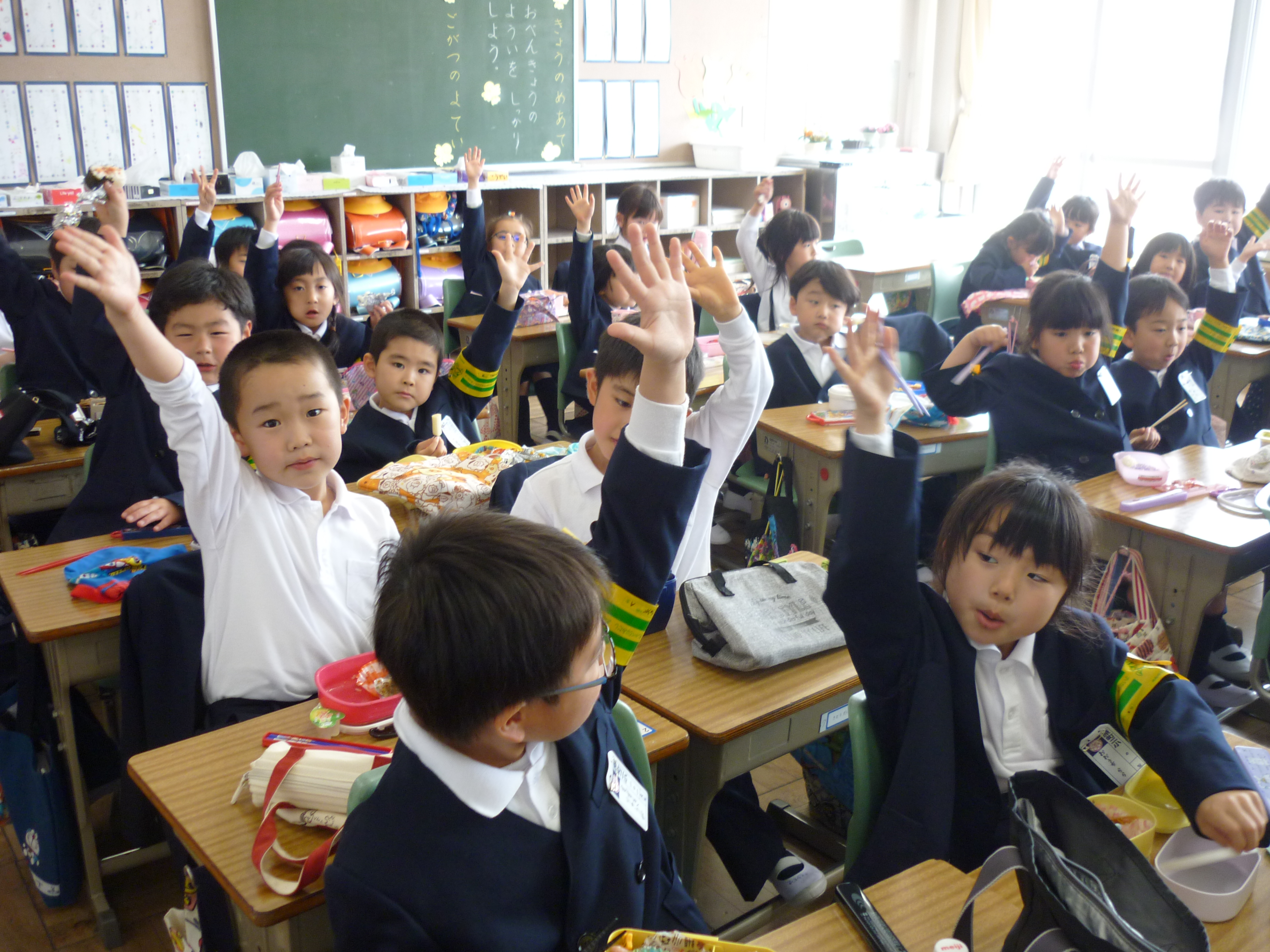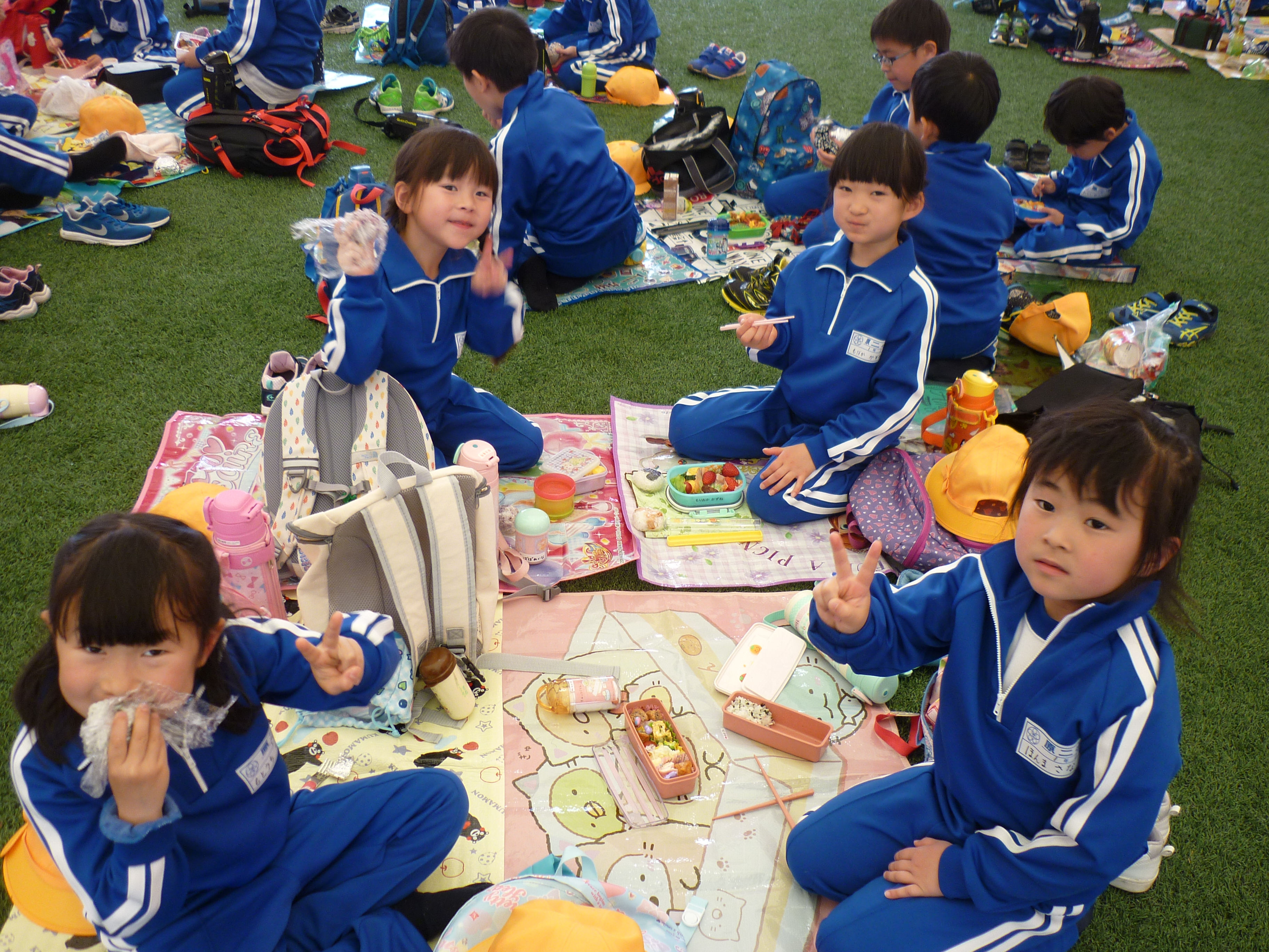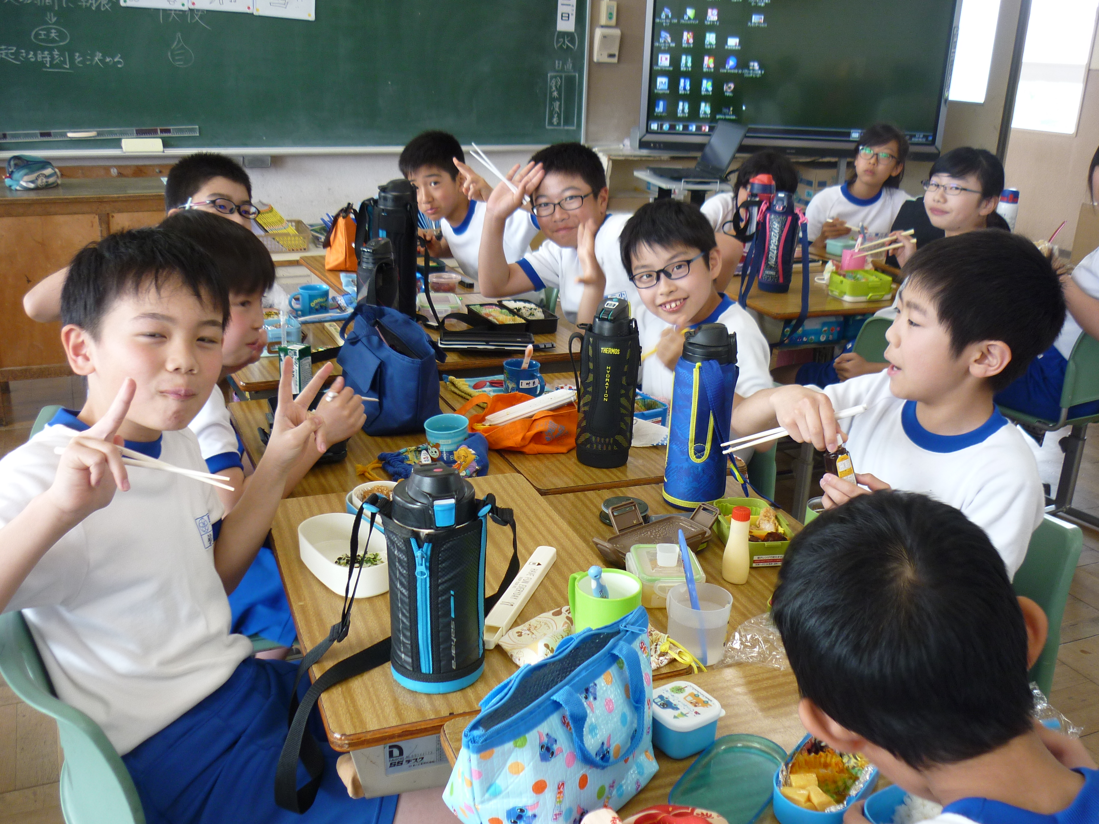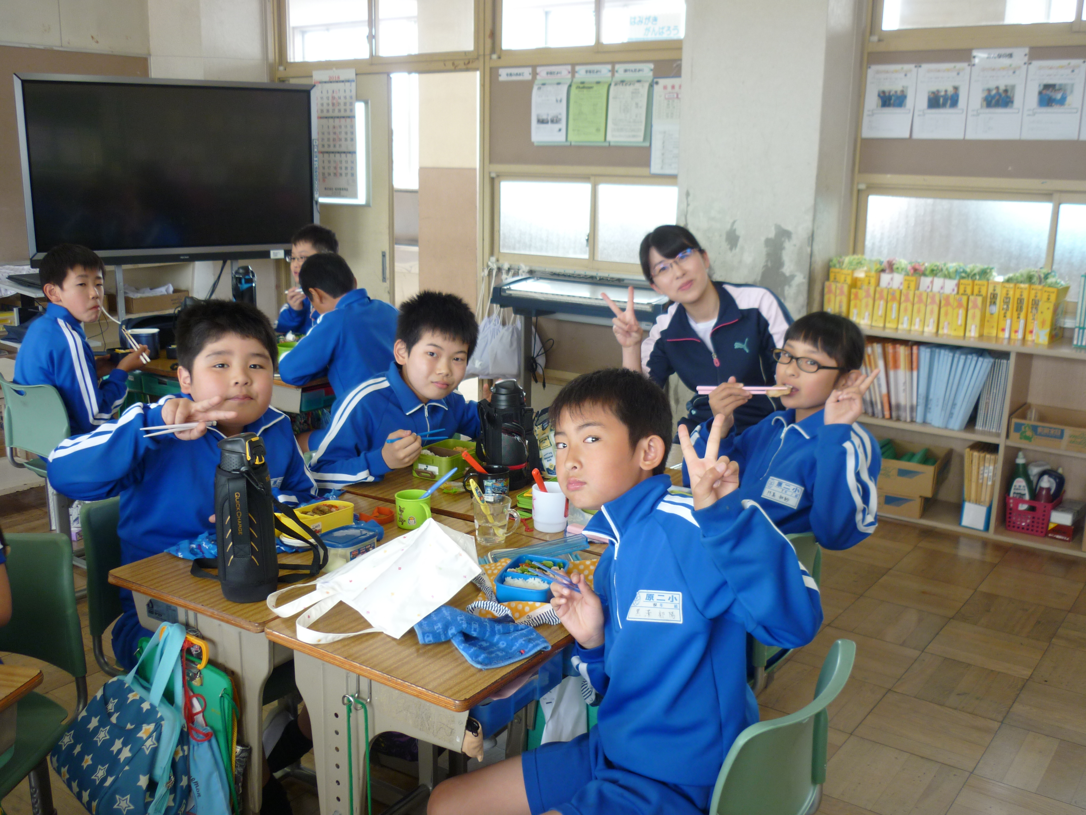 2018年5月2日 12時54分今日は、遠足予備日のため、お弁当の日でした。12時のチャイムを聞くと一斉にお家から持ってきたお弁当をひろげ、美味しそうに食べ始めました。1年生に「お弁当も好きな人は?」と尋ねると、ほとんどの児童が「はい」「大好き」と手を挙げて返事をしていました。お家の方の愛情たっぷりなお弁当に笑顔がこぼれ、満足感が十分に感じられました。お弁当を食べて、後半のゴールデンウィークに突入です。お忙しい中、ありがとうございました。