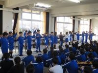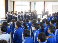 5日(月)の全校集会では、1年生と4年生が、それぞれ音楽で学習した曲の発表をしました。1年生の歌に合わせ、全校生が「じゃんけんぽん」をしたり、4年生の曲で今月の歌を歌ったりしました。週の始めの朝から、笑顔になりました。