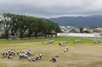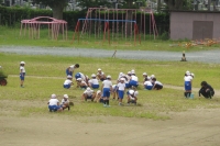 今年の夏は、例年になく校庭の草が広がり、緑になってしまいました。8月27日にPTAの奉仕作業を行い、親子で除草しましたが、まだまだ残っていました。先週、6年生や5年生が休み時間除草しましたが、それでも残っています。そこで、6年生から全校生によびかけ、今週の昼休みに15分間の除草をすることになりました。