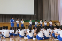 2017年7月12日 16時07分 震災後、教育委員会の支援事業として始まった活動を今年も「ワンパク大学」の方々にお願いし、低学年のレクリェーションを実施しました。2年生の子どもたちは、昨年度2回お世話になっているので、先生の呼び名を忘れずに覚えていました。1年生の前で、先輩を確認したようでした。当初は校庭での活動を予定していましたが、熱中症を心配し、体育館で行いました。
