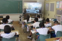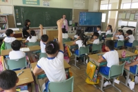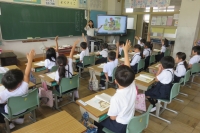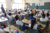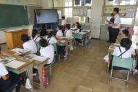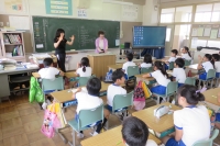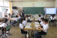 原町二小では、3年、4年では、総合に位置付けられた国際理解の時間に、ALTのヤング先生と一緒に活動しています。年17時間の計画です。担任の先生も子どもたちと一緒にヤング先生の英語を聴き、補助発問をします。