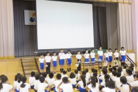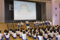 保健委員会では、「イライラしたとき、どうする?」の紙芝居をスクリーンに映し、委員が読み聞かせをしました。深呼吸をしたり、肩を上下させたりして、気分転換することを伝えてくれました。みんなで、ちょっぴりその動作をしてみました。