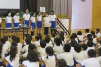 26日(月)の全校集会では、環境委員会と保健委員会の皆さんが全校生に委員会の活動内容を説明したり、呼びかけたりしました。