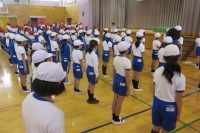 雨天と校庭の水たまりのため、本日、校庭での初全体練習を行いました。体育館で一度流れを確認していたので、スムーズに開会式、閉会式を進めることができました。6年生が一人一役で役割を持ち、頑張っています。1年生も大きな声をだし、ようやく覚えた校歌を歌っていました。