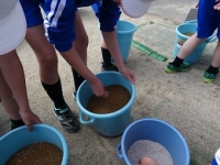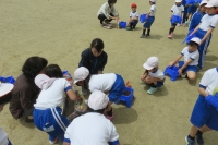2017年5月12日 08時45分 今年もバケツ稲栽培が始まりました。子どもたちにとっては、田んぼ擬きのバケツの土の感触や稲の苗を見るのも初めての子がほとんどです。大きな田んぼでの経験もさせたいところですが、町中の小学校ですので、バケツで我慢しましょう。