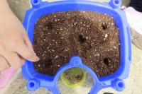 9日(火)1年生が生活科の学習でアサガオの種植えをしました。身の回りの花などを見てはいても、土を準備し、種を植える経験は数少ないようです。人差し指の第1関節あたりまでの穴を開けて、全部で5粒の種を植えました。