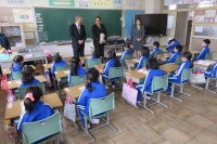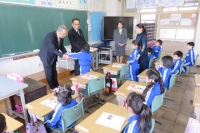 原町ロータリークラブの皆さんから、1年生にノートとぬり絵のプレゼントを本日いただきました。毎年続けられている活動です。1年生の代表が「ありがとうございます」とお礼を言いました。本校卒業のBでもある堀川さんから「元気にあいさつ、返事などをしてください。」とお話いただきました。
