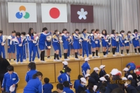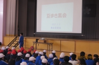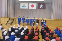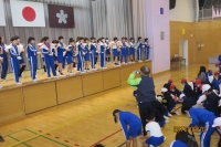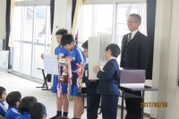 6日(月)全校集会がありました。最初に「なわとび大会」の表彰をしました。2重跳びで第一位の江上さん136回でした。続いて、バスケットボールスポ少の男子