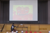 3日(金)の2校時、児童会集会活動で、集会委員会運営による「豆まき集会」が開かれました。絵本をもとにした紙芝居、「追い出したい鬼」の発表、学年対抗鬼退治(紅白玉で鬼を倒すゲーム)、年男、年女の5年生による豆まきとみんなが活躍できる集会となりました。