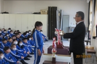 地区大会優勝の表彰です。とても大きな優勝杯、トロフィーなどがありました。このスポ少は、原町一小や三小の児童も参加しているチームです。この後、各校で表彰があることでしょう。