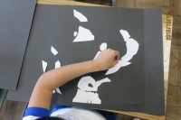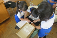 12日(水)、今年度から校内研究を進めている図工の授業研究を実施しました。2年生の「はさみのあーと」という題材でした。はさみを使って初めて見た形を切ってみようという活動を前時にしました。本時は、切った形が何に見えるか、子どもたちが話したり、黒い画用紙に切った形を置いて、「○○○の世界」だよと並べてできた形を楽しんでいました。表現と言語活動、鑑賞などの過程の中で、生き生きと活動していたように思います。