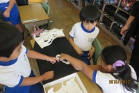 2016年10月13日 08時59分 12日(水)、今年度から校内研究を進めている図工の授業研究を実施しました。2年生の「はさみのあーと」という題材でした。はさみを使って初めて見た形を切ってみようという活動を前時にしました。本時は、切った形が何に見えるか、子どもたちが話したり、黒い画用紙に切った形を置いて、「○○○の世界」だよと並べてできた形を楽しんでいました。表現と言語活動、鑑賞などの過程の中で、生き生きと活動していたように思います。