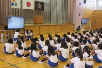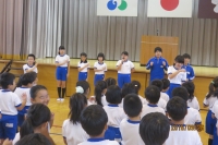 26日の全校集会では、図書委員会児童が『だいじょうぶだいじょうぶ』(いとうひろし作)の読み聞かせと手遊びを発表しました。読み聞かせは、電子黒板を体育館に移動し、拡大した絵を見せながらの発表でした。絵本の中のおじいちゃんのやさしさを感じることができました。