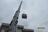 2016年8月8日 10時28分 夏休みを利用して、施設の補修工事が進んでいます。今日は、高架水槽の入れ替え作業と中央玄関のタイル補修工事が始まりました。大型クレーンでこれまでお世話になった水槽を下ろしています。風が強くなる前に作業終了したいですね。