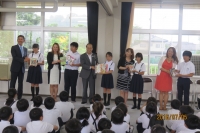 5日(火)の昼休み、「ニュースキンジャパン株式会社」と「公益財団法人セカンドハーベストジャパン」の方々10名が来校し、図書50万円分(316冊)の贈呈と一人一人に文房具セットのプレゼントがありました。小林社長さん自ら原町二小に来校されての贈呈となりました。ありがとうございました。