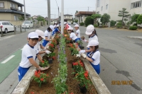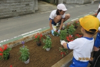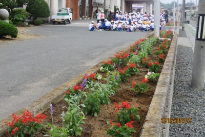 27日(金)雨があがった5校時に校舎北側 約100メートルの長さがある花壇にサルビア、ブルーサルビア、ペチュニアなどの花を植えました。全校生が24班の縦割りグループに別れ、上級生のお世話できれいに植えることができたようです。
