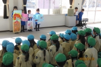間もなく卒園、小学校入学ということで、原町二小学区内にある青葉幼稚園のお友達51名が来校し、1年生から小学校の勉強や遊具を教えてもらい、メダルをプレゼントしました。1年生もほんの少~し先輩になって、発表しました。