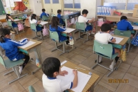 1年生の教室に入って、少し大きい机、イスも体験した年長さんたちでした。