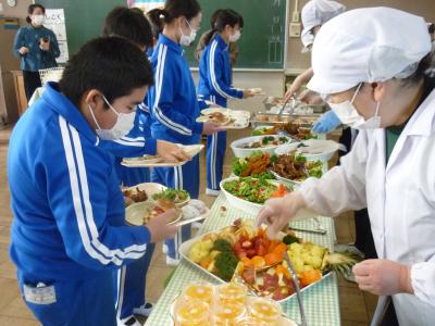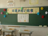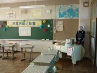 2021年2月18日 15時30分本日、18日(木)は、卒業生が楽しみにしていた『卒業お楽しみ給食』でした。6年生が2つの教室に分かれての実施となりましたが、栄養士の先生や調理員の方々がたくさんのメニューを考えて、朝早くから調理してくださいました。コロナ対策のため、配膳は全て栄養士と調理員、事務の先生で行いました。6年生はお盆を持って料理の置かれたテーブルを進みながら、食べたいごはんやおかずを配膳してもらいました。食べ終わるとすぐにおかわりをして、全て料理は完食でした。6年生にとっては、また一つ思い出ができました。教室の飾り付けやテーブルクロスの準備、調理や配膳にご協力いただいた教職員に感謝ですね。