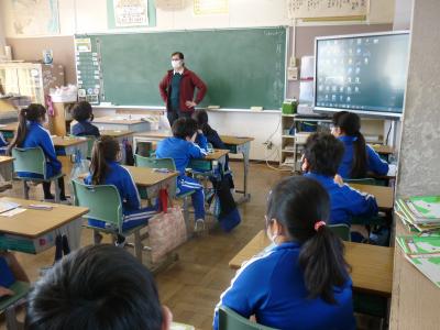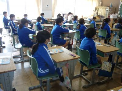 これまで3年生は、3密を避けるために、多目的室を教室にして学習してきました。ただ、冬になってから、シューズを脱いだ足の裏は、床がかなり冷たく感じるようになりました。そこで、子供たちの体調面や学習への集中を考え、2月初めに本来の3年生教室に戻って学習するようにしました。子供たちは、「冷たくない」とか「やっぱり教室がいいな」といっていました。これまで以上にコロナ感染防止を徹底していきたいです。